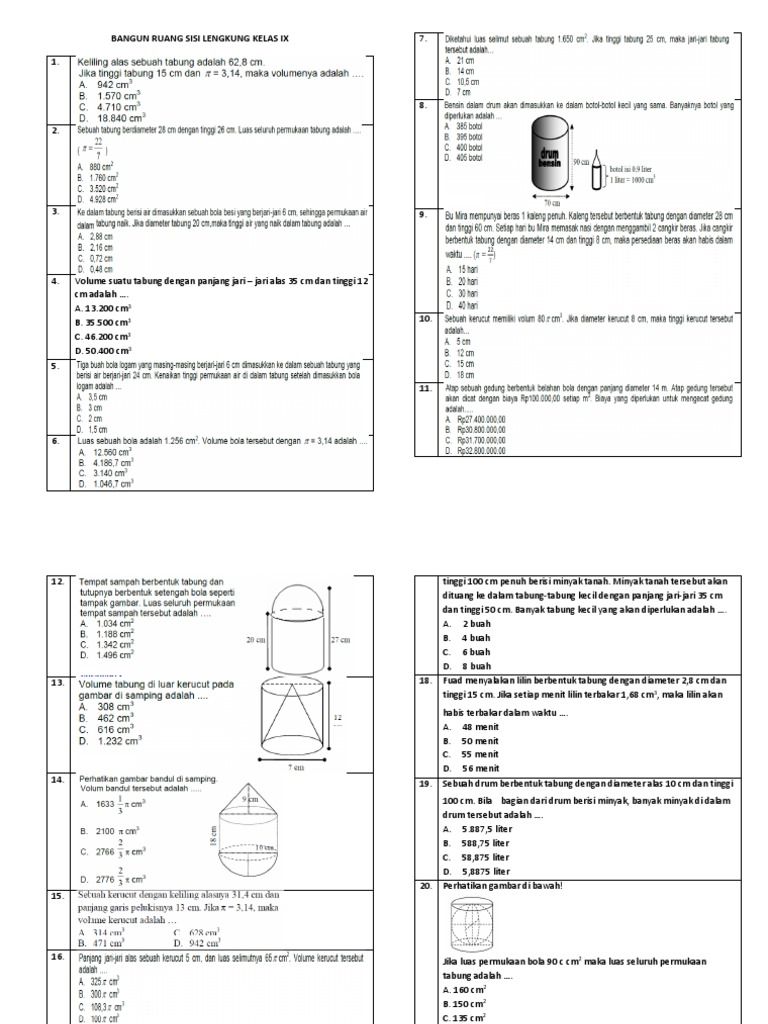 4. Volume suatu tabung dengan panjang jari – jari alas 35 cm dan tinggi 12