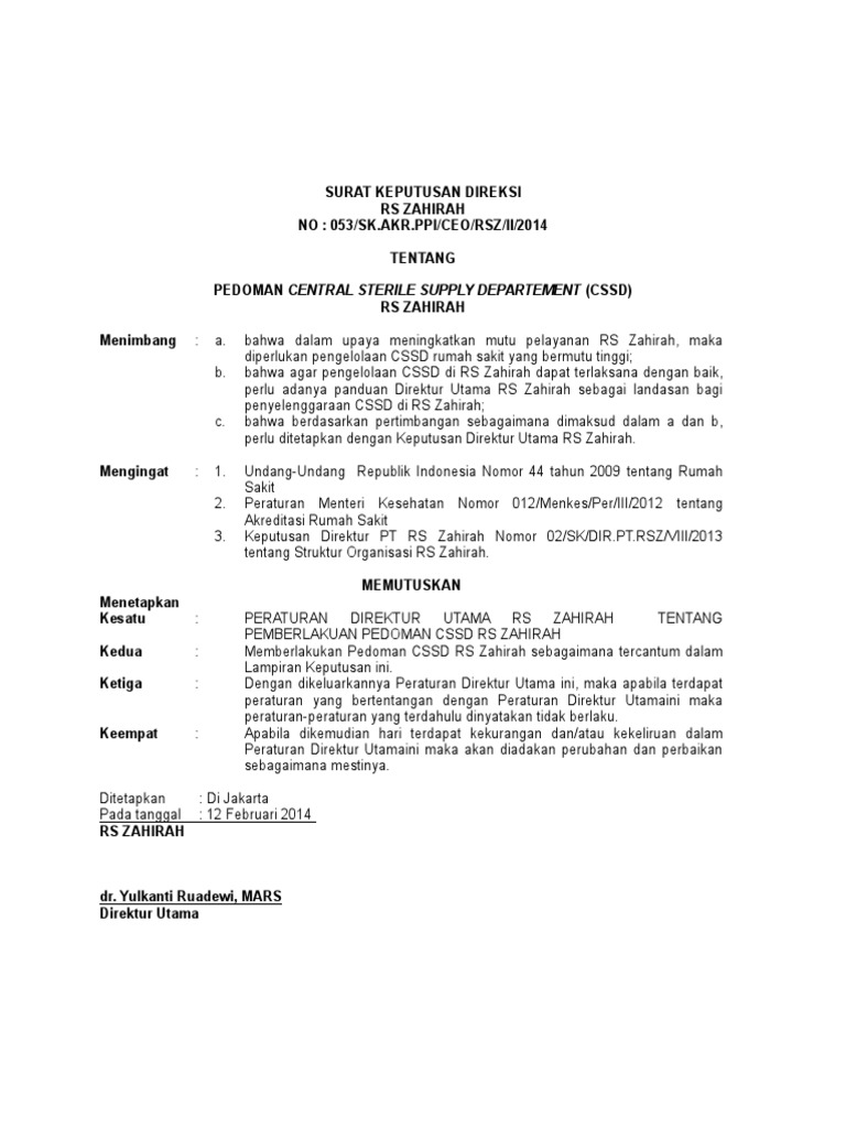 b. bahwa agar pengelolaan CSSD di RS Zahirah dapat terlaksana dengan baik,