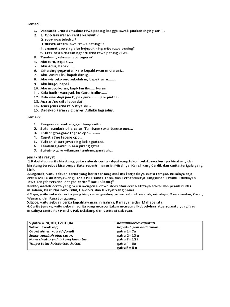 14. Jenis-jenis crita rakyat yaiku:….