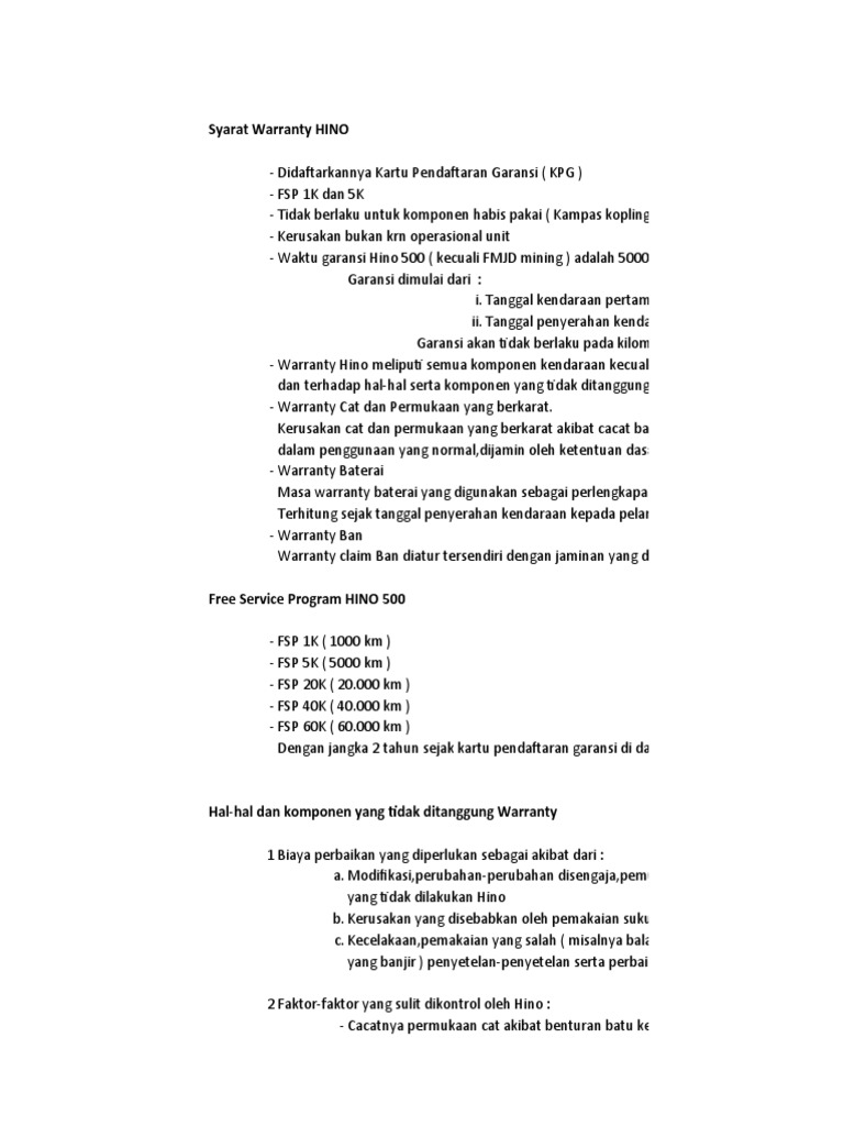 - Warranty Hino meliputi semua komponen kendaraan kecuali Baterai,Knalpot,Ban,komponen