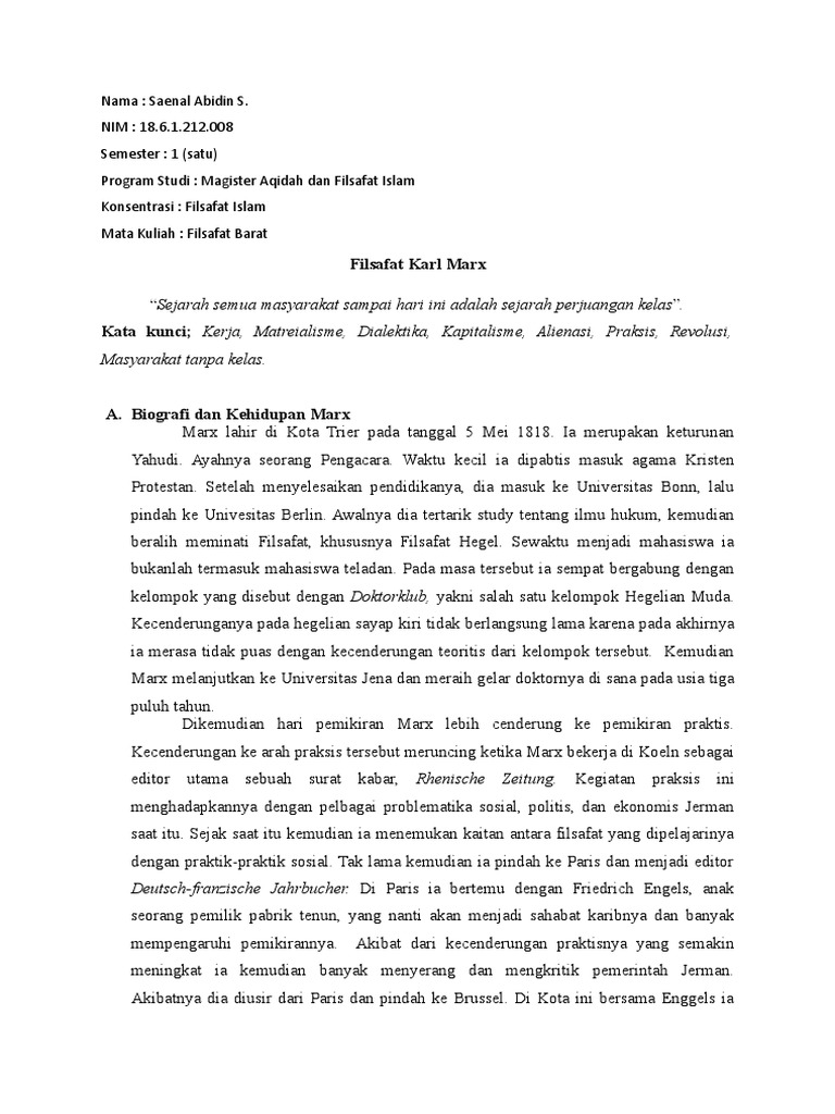 Kata kunci; Kerja, Matreialisme, Dialektika, Kapitalisme, Alienasi, Praksis, Revolusi,
