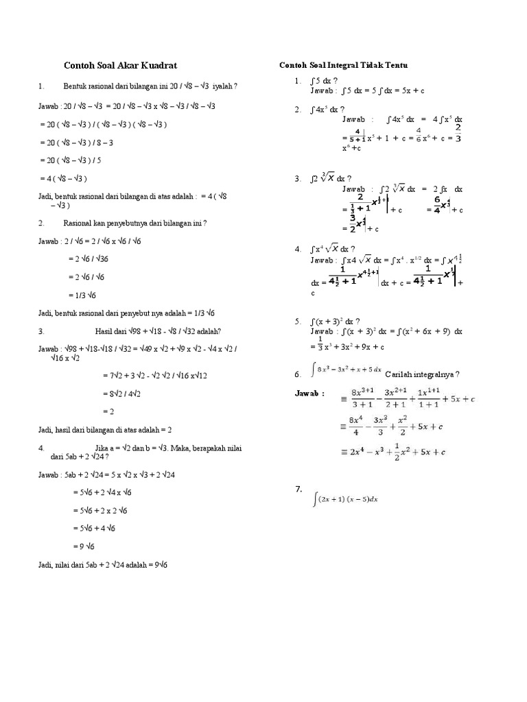 Contoh Soal Akar Kuadrat Contoh Soal Integral Tidak Tentu