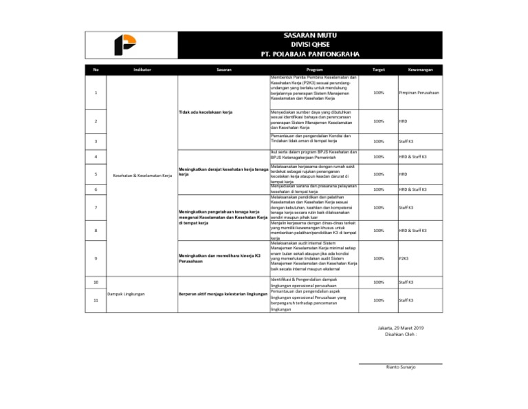 Tidak ada kecelakaan kerja Menyediakan sumber daya yang dibutuhkan
