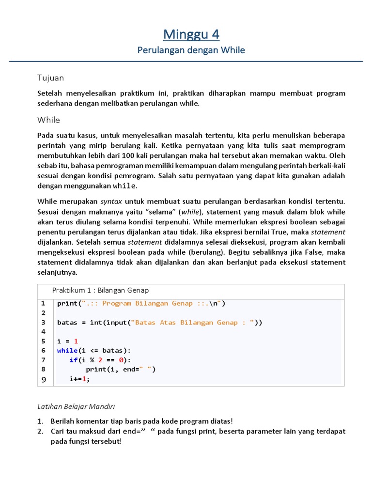 akan terus diulang selama kondisi terpenuhi. While memerlukan ekspresi boolean sebagai
