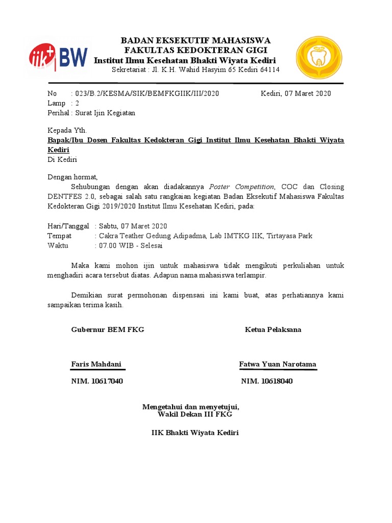 No : 023/B.2/KESMA/SIK/BEMFKGIIK/III/2020 Kediri, 07 Maret 2020