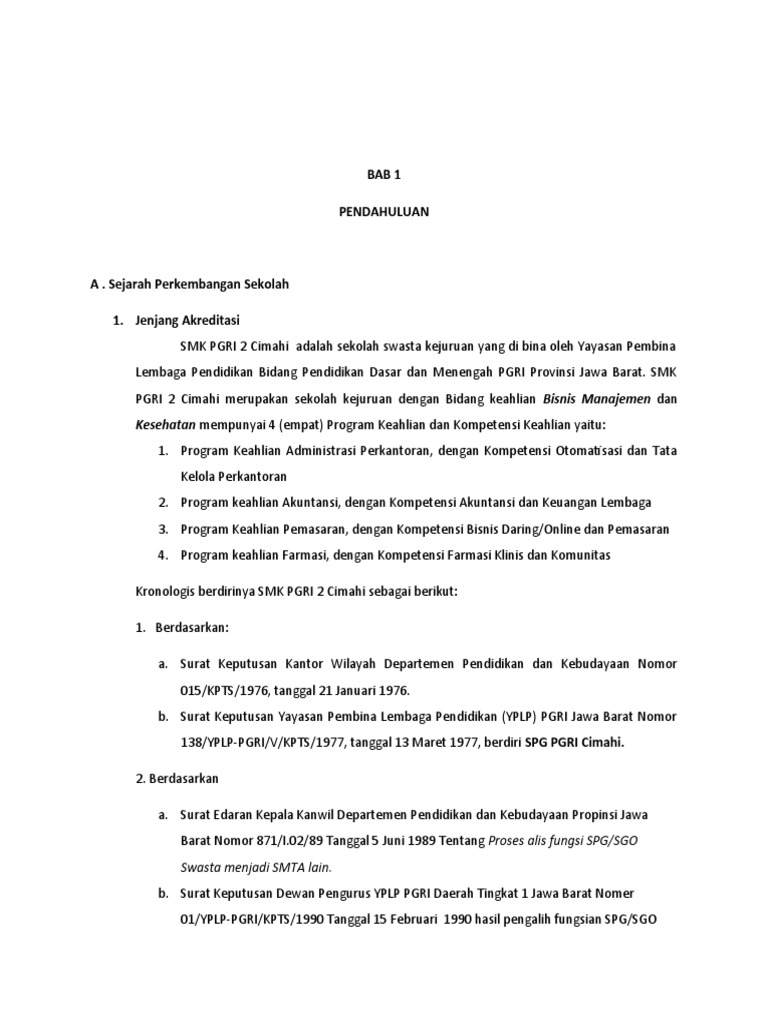e. Status SMK PGRI 2 Cimahi, mulai tahun pelajaran 2010/2011 dengan Surat Keputusan