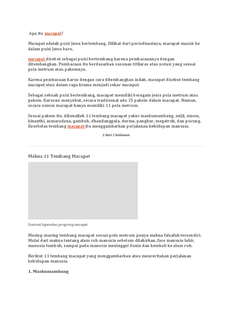 Macapat adalah puisi Jawa bertembang. Dilihat dari periodisasinya, macapat masuk ke