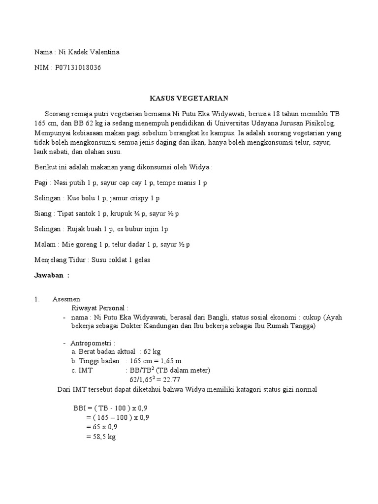 Seorang remaja putri vegetarian bernama Ni Putu Eka Widyawati, berusia 18 tahun memiliki TB