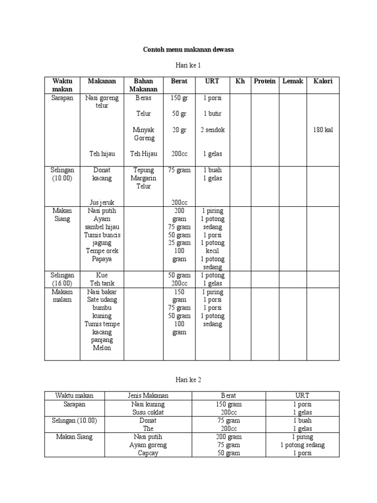 Waktu Makanan Bahan Berat URT Kh Protein Lemak Kalori