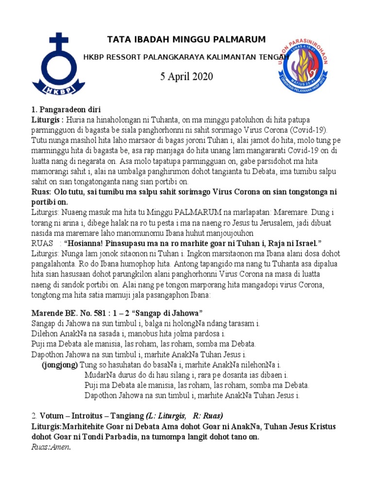 Liturgis: Nuaeng masuk ma hita tu Minggu PALMARUM na marlapatan: Maremare. Dung i