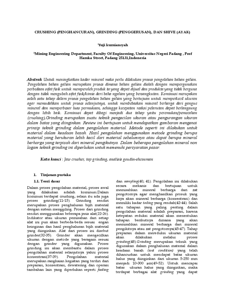 (Crushing) Peremukan adalah proses reduksi Grinding atau penggerusan merupakan