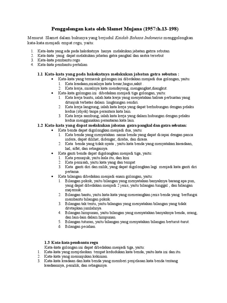 Menurut Slamet dalam bukunya yang berjudul Kaidah Bahasa Indonesia menggolongkan
