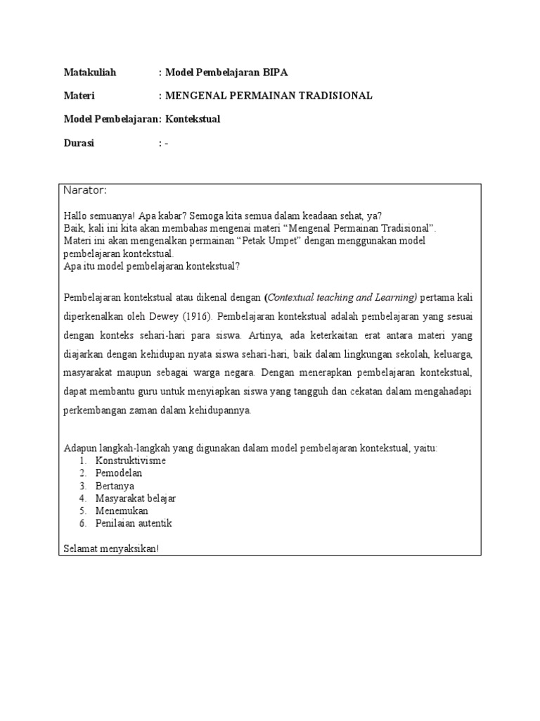 Guru : “Hari ini kita akan belajar mengenal permainan tradisional Indonesia.
