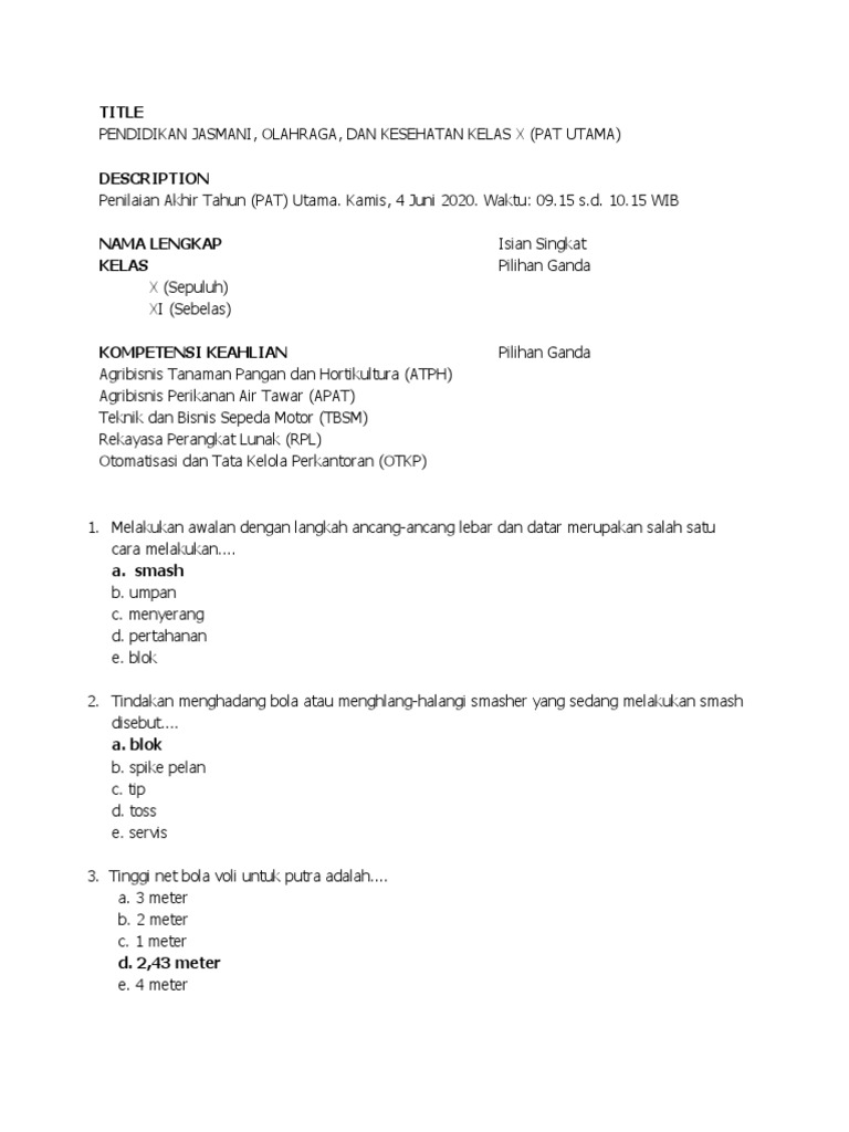 PENDIDIKAN JASMANI, OLAHRAGA, DAN KESEHATAN KELAS X (PAT UTAMA)