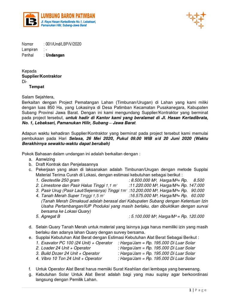 Berkaitan dengan Project Pematangan Lahan (Timbunan/Urugan) di Lahan yang kami miliki