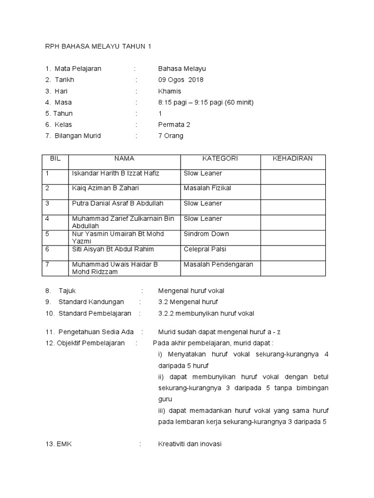 RPH BAHASA MELAYU TAHUN 1