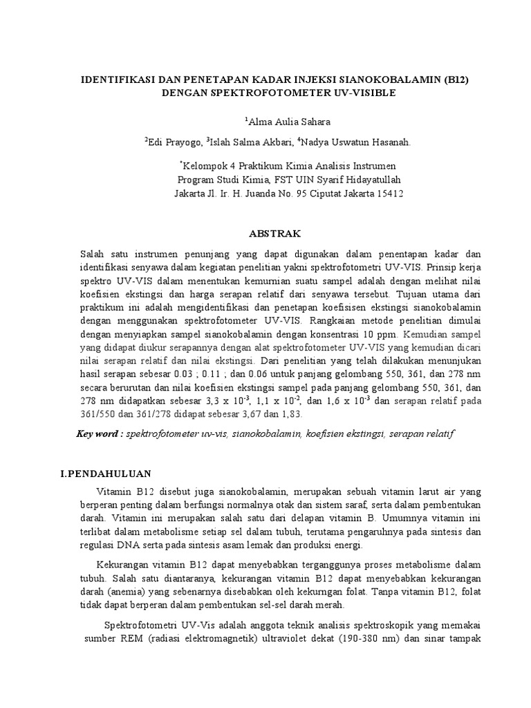 Key word : spektrofotometer uv-vis, sianokobalamin, koefisien ekstingsi, serapan relatif