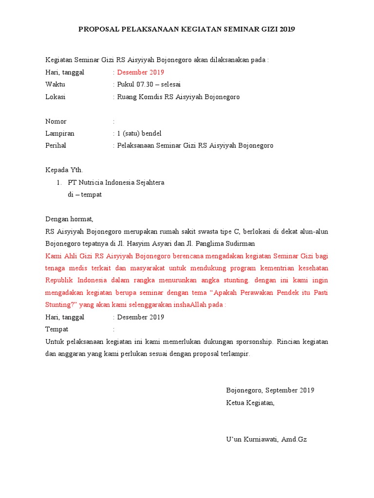 Perihal : Pelaksanaan Seminar Gizi RS Aisyiyah Bojonegoro