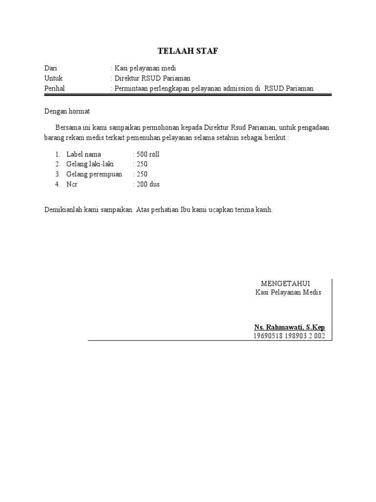 Perihal : Permintaan perlengkapan pelayanan admission di RSUD Pariaman