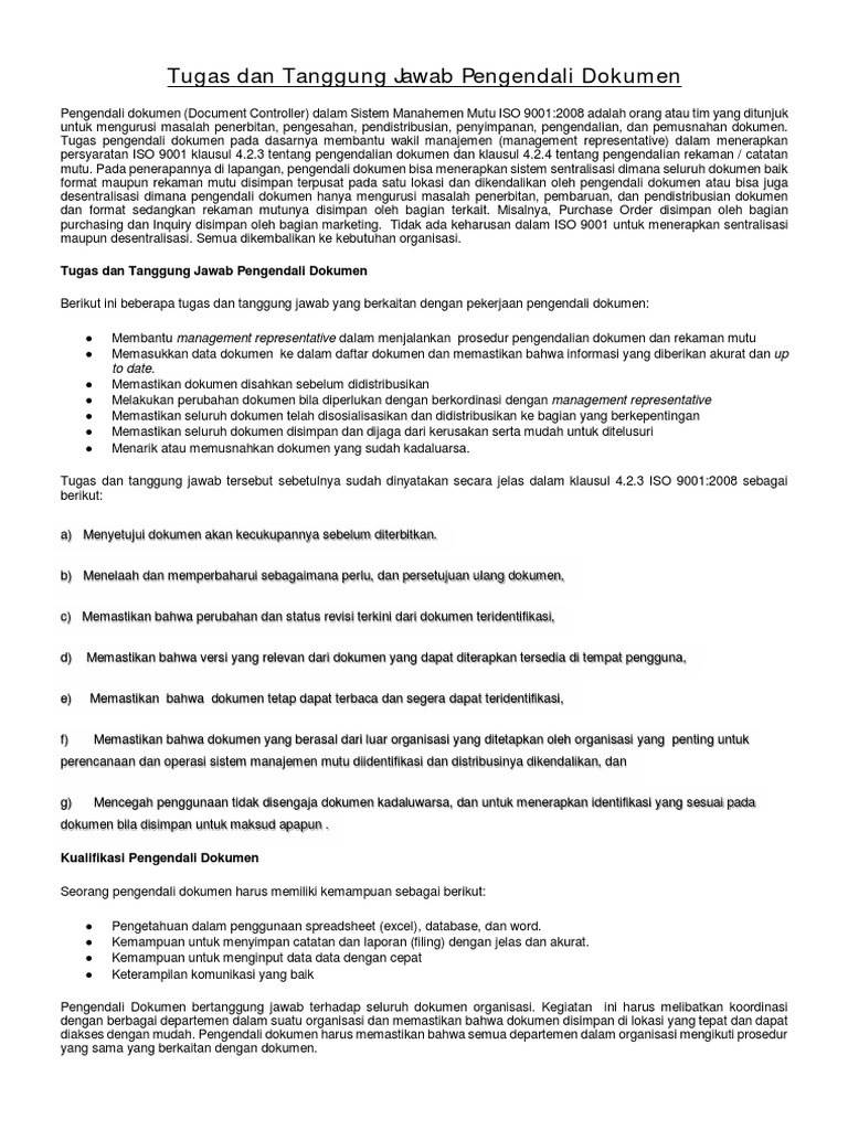 Tugas dan tanggung jawab tersebut sebetulnya sudah dinyatakan secara jelas dalam klausul 4.2.3 ISO 9001:2008 sebagai