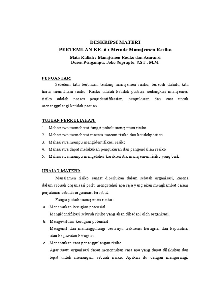 PERTEMUAN KE- 6 : Metode Manajemen Resiko