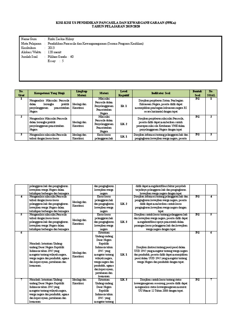 KISI-KISI US PENDIDIKAN PANCASILA DAN KEWARGANEGARAAN (PPKn)