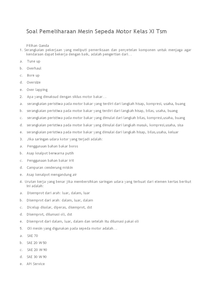 Soal Pemeliharaan Mesin Sepeda Motor Kelas XI Tsm