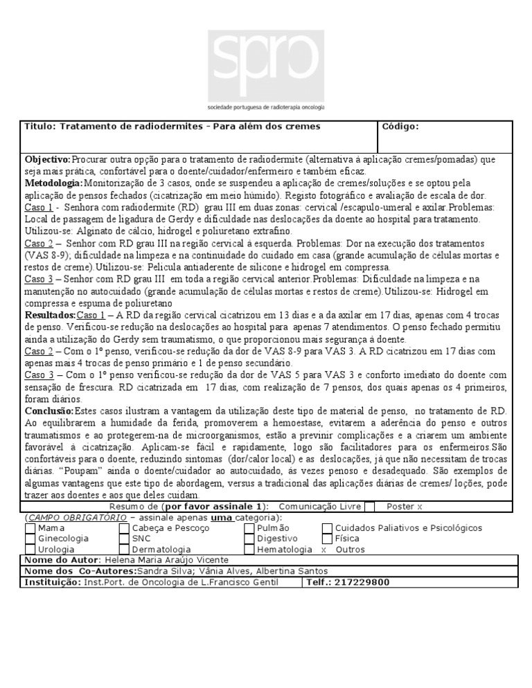Objectivo:Procurar outra opção para o tratamento de radiodermite (alternativa à aplicação cremes/pomadas) que