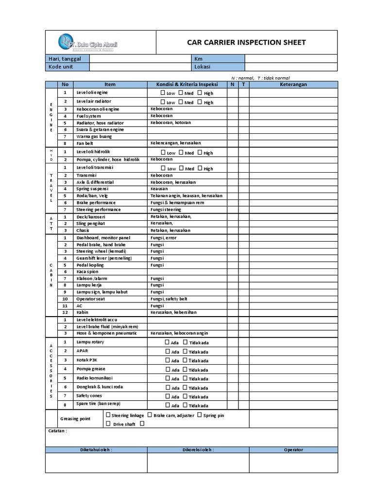 No Item Kondisi & Kriteria Inspeksi N T Keterangan