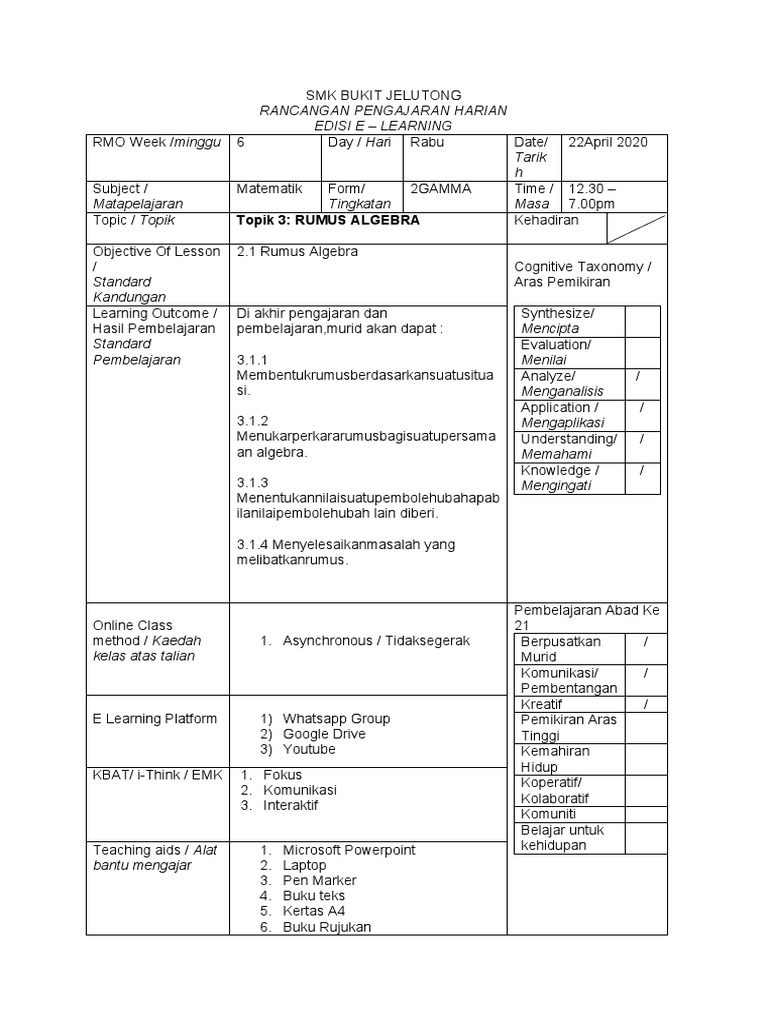 Objective Of Lesson 2.1 Rumus Algebra