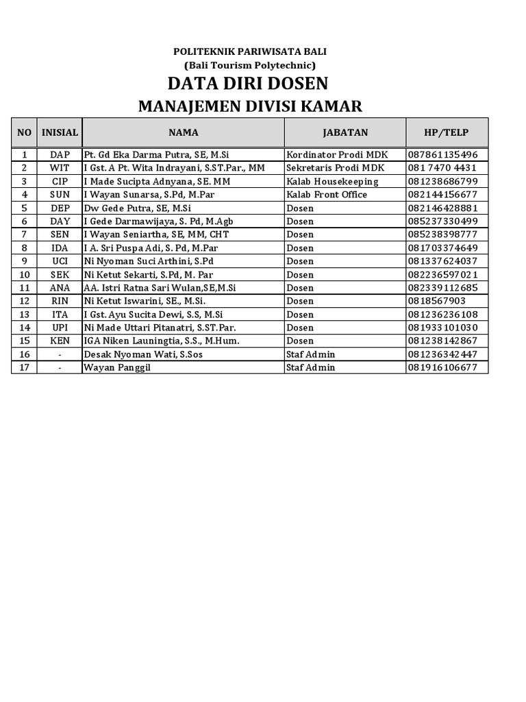 4 SUN I Wayan Sunarsa, S.Pd, M.Par Kalab Front Office 082144156677