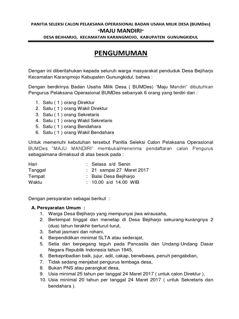 BUMDes “MAJU MANDIRI” membuka/menerima pendaftaran calon Pengurus
