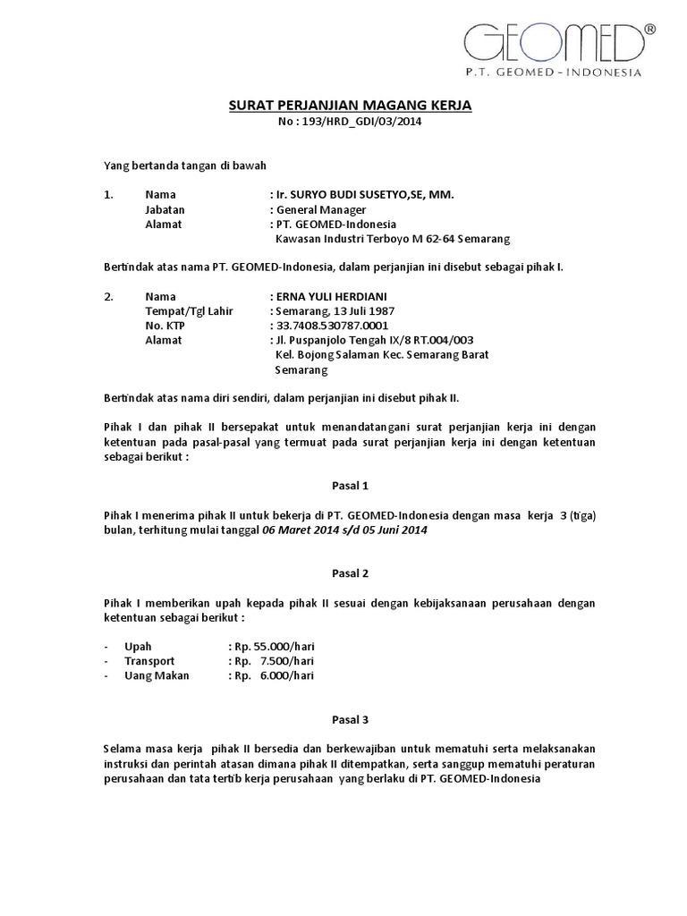 Pihak I menerima pihak II untuk bekerja di PT. GEOMED-Indonesia dengan masa kerja 3 (tiga)