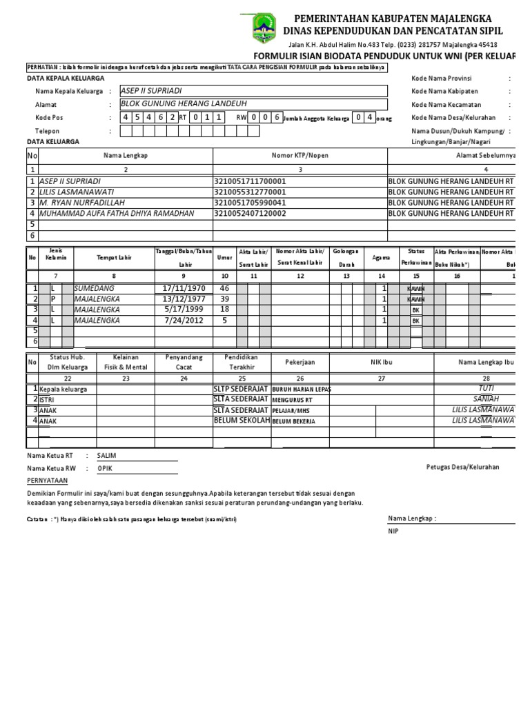 FORMULIR ISIAN BIODATA PENDUDUK UNTUK WNI (PER KELUARGA)