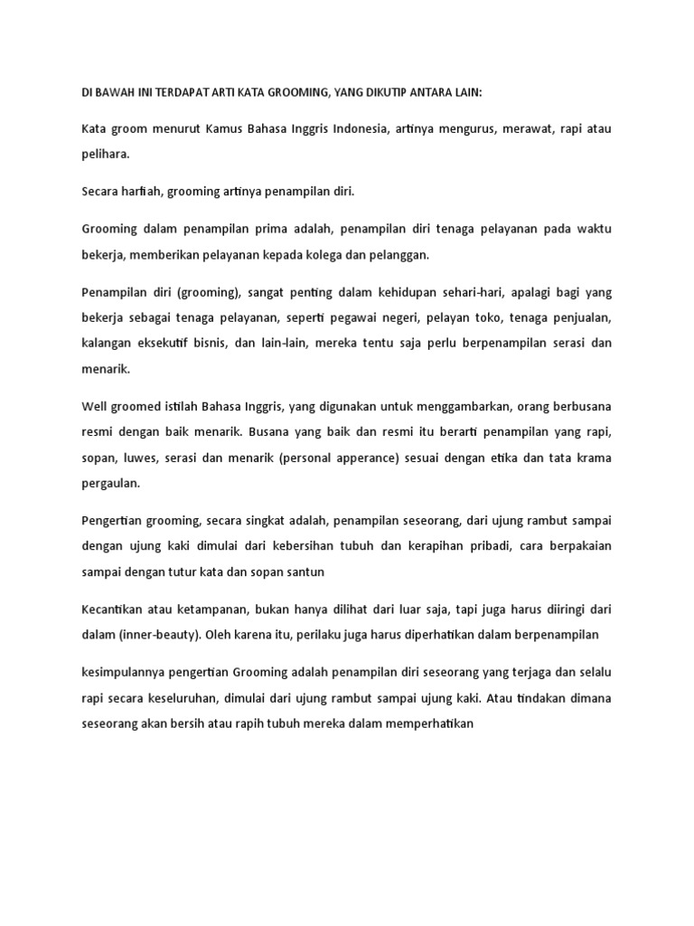 DI BAWAH INI TERDAPAT ARTI KATA GROOMING, YANG DIKUTIP ANTARA LAIN:
