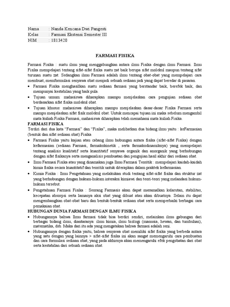 Farmasi Fisika yaitu kajian atau cabang ilmu hubungan antara fisika (sifat-sifat Fisika) dengan