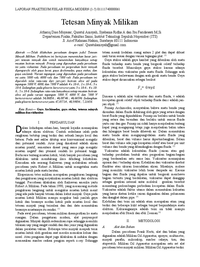 berat benda. Pada keadaan pertama, tetes minyak bergerak Nya, yang kedua kepada Bu Faridah selaku dosen Fisika