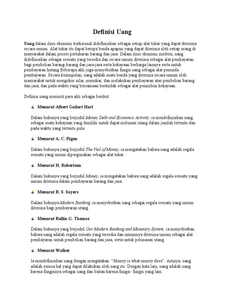 uang adalah segala sesuatu yang biasanya digunakan dan diterima secara umum sebagai alat