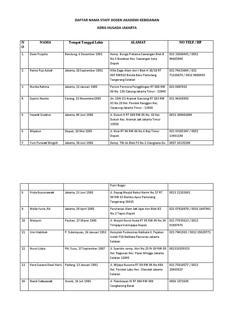 13. Vera Suzana Dewi Haris Padang, 13 Januari 1981 Jl. Wijaya Kusuma RT 09 RW 04 No.48A 021 75818577 / 0813