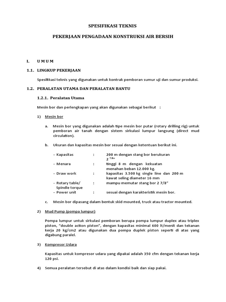Spesifikasi teknis yang digunakan untuk kontrak pemboran sumur uji dan sumur produksi.