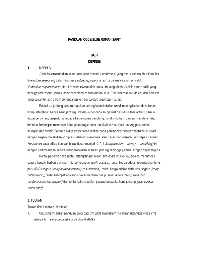 1. Untuk memberikan panduan baku bagi tim code blue dalam melaksanakan tugas-tugasnya