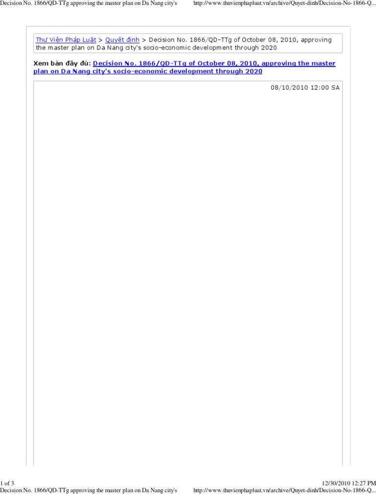 Xem bản đầy đủ: Decision No. 1866/QD-TTg of October 08, 2010, approving the master plan on Da Nang city's socio-economic development through 2020