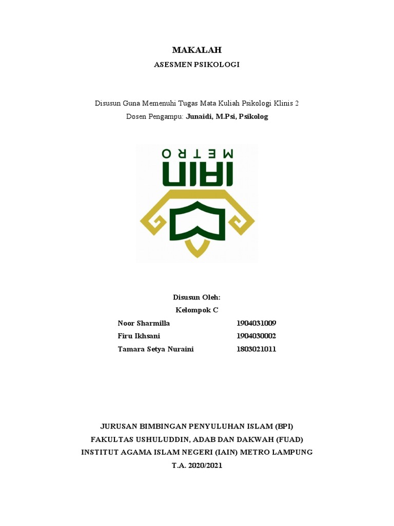 dengan judul “Asesmen Psikologi” dengan baik dan lancar. Makalah ini disusun guna