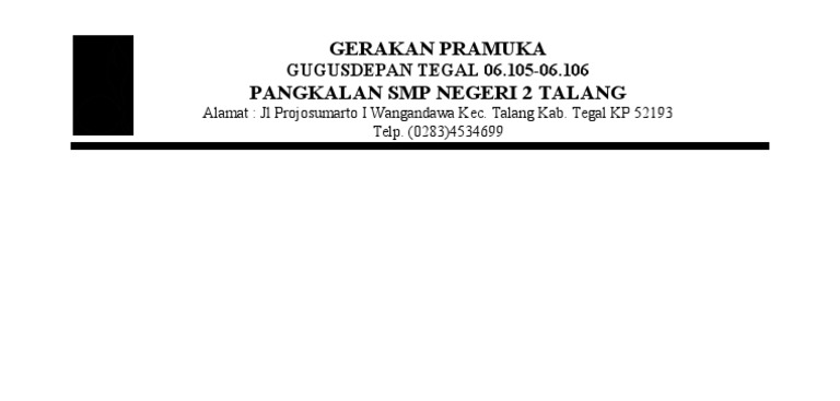 Gerakan Pramuka Gugusdepan Tegal 06.105-06.106 berlokasi di Pangkalan SMP Negeri 2 Talang di Jalan Projosumarto I Wangandawa Kecamatan Talang Kabupaten Tegal dengan nomor telepon (0283)4534699.