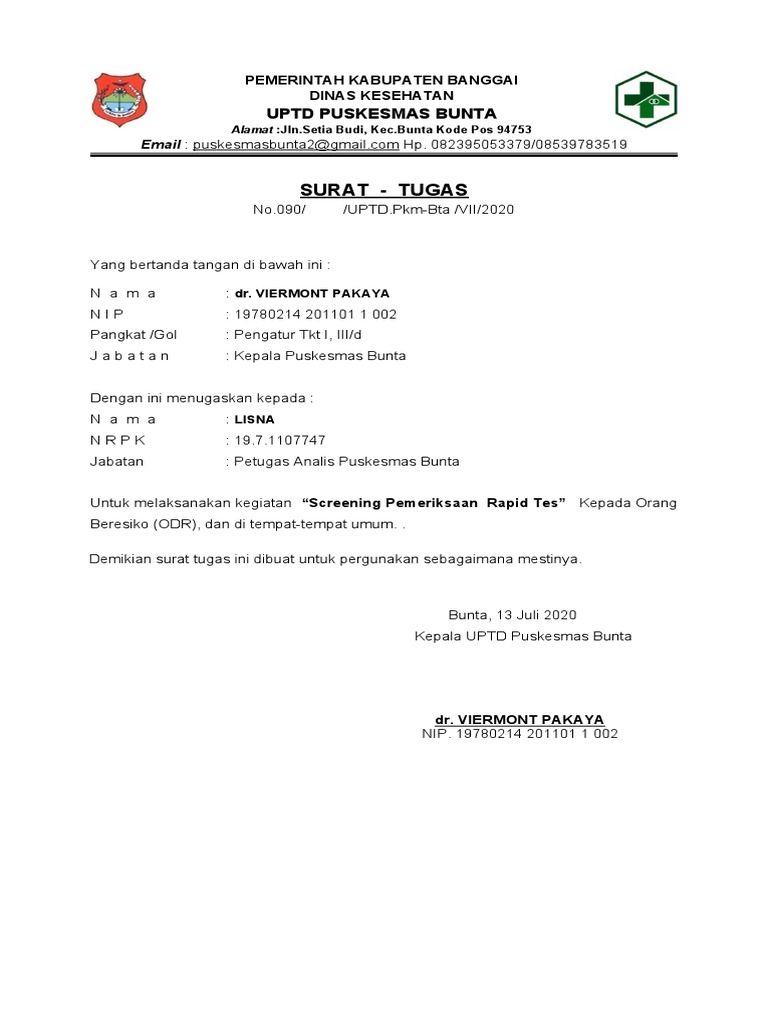 Yang bertanda tangan di bawah ini, Kepala UPTD Puskesmas Bunta dengan ini menugaskan