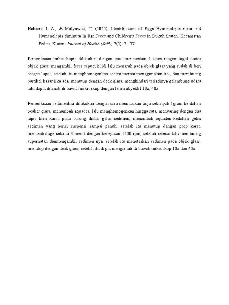 Habsari, I. A., & Mulyowati, T. (2020). Identification of Eggs Hymenolepis nana and