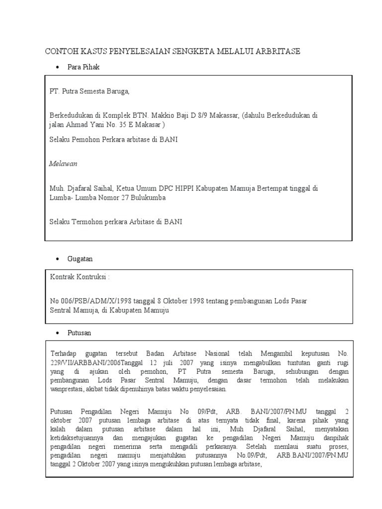 CONTOH KASUS PENYELESAIAN SENGKETA MELALUI ARBRITASE
