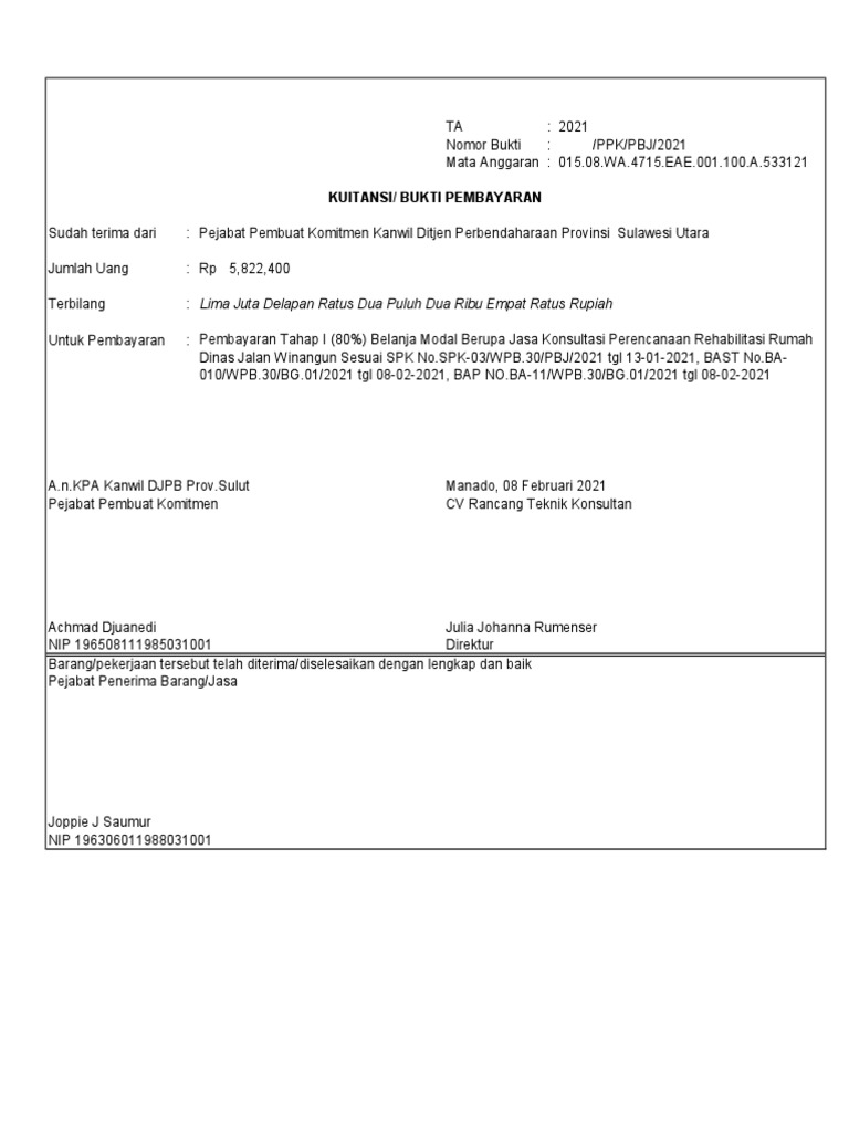 Sudah terima dari : Pejabat Pembuat Komitmen Kanwil Ditjen Perbendaharaan Provinsi Sulawesi Utara