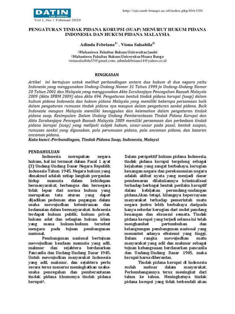 Kata kunci :Perbandingan, Tindak Pidana Suap, Indonesia, Malaysi