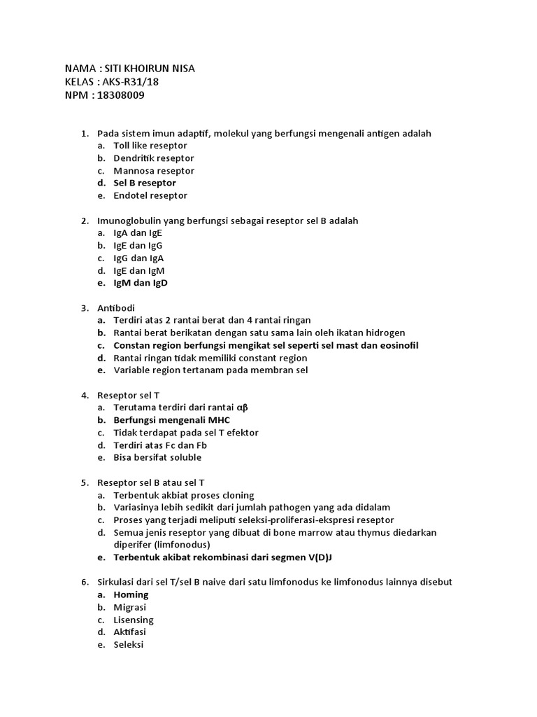1. Pada sistem imun adaptif, molekul yang berfungsi mengenali antigen adalah